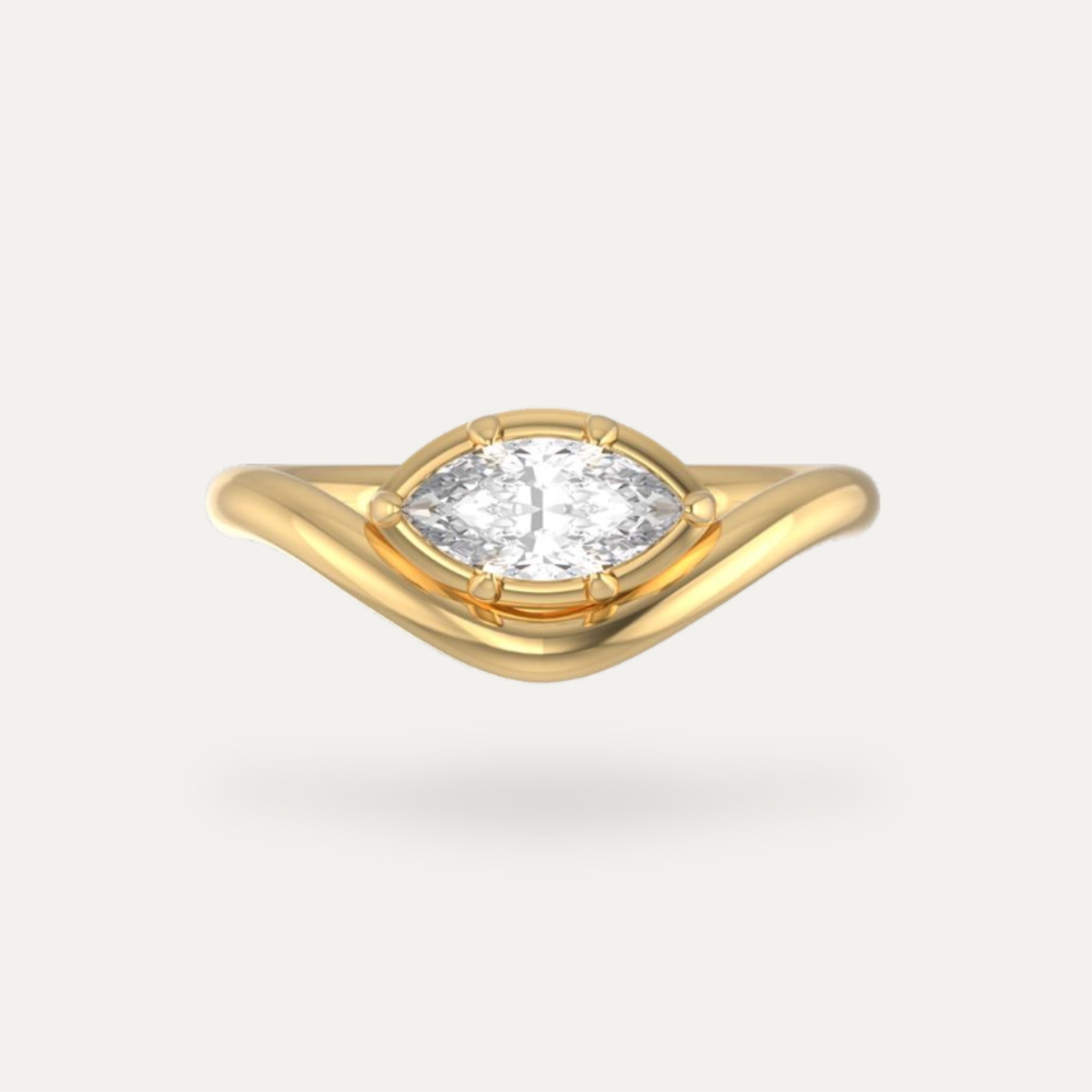 This marquise diamond ring features a French-set center stone, with a unique bezel+prong combination, enhancing brilliance and durability. The stone sits on a 14k curved silhouette, wrapping elegantly around your finger. Designed as the ultimate statement pink ring, but versatile enough to be worn on any finger.