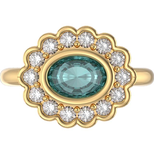 Crafted in 14k solid gold, the ring features a 7x5mm oval gemstone of your choice, surrounded by a 2mm diamond halo, with options of lab or natural diamonds.